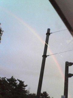 帰り、友人のしーちゃんに送ってもらってると、一緒にセミナーに参加してたこれまたセラピスト仲間のまりちゃんから、「虹が出てるよー」っていう電話。車の中から大きくてきれいな「虹」がみえました。