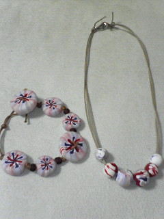 まずは、粘土の色選び。好きな2色を選びます。そして、白と透明の粘土と選んだ色つきの粘土を3層にして金太郎飴のようにまるめて、のばして、輪切りして・・・。紐を通す穴を開けて、最後にオーブンで焼くと、かわいい飴のようなものが焼きあがります。それを、間にビーズを挟みながら、紐に通していって出来上がり(^^)
