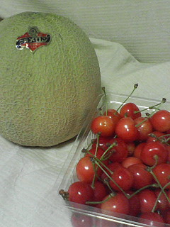 札幌からは、メロン。山形からはさくらんぼ。両方、とっても高価なフルーツなのに、本当にありがたいことです。メロンは、食べごろの目安というメモがありましたが、やはりこちらの方が圧倒的に暖かいからか、出してみると、食べごろの色に。明日にでも頂いてみようと思います(^^)
