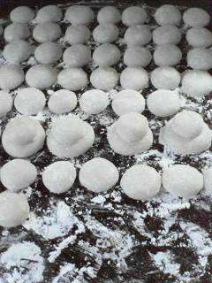 つけたものを、絞り機に入れ、それを回すのがダーリン。搾り出されたものを切るのがお父さん。お母さんと私は丸める役。