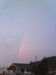 前日の夜、あんなに綺麗な星空だったのに、朝は小雨がぱらつく天気。みんなで歩いて港まで歩いていると、綺麗な朝焼けと、綺麗な虹が。。。虹も全体的に朝焼け色に染まってました(^^)