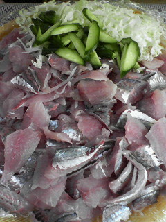 義弟が3枚におろしたものを、わたしが皮をはぎ、母が刺身にし、氷水に漬けて余分な油を落とし、身を締める。三瓶名物の「鯵のあらい」です。