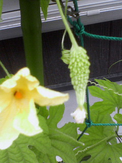 やっと、なんとか「ゴーヤ」だとわかるくらいの実がなってくれました(^^)
