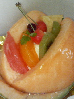 メロンが器になっていて、くり抜かれたメロンの中にプリンやフルーツ、スポンジケーキなどが盛りだくさんに入ってました!!