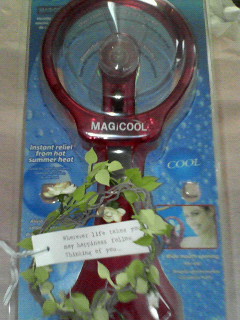 写真のウォーターミストファン クイッククールを頂きました(^^)「クイック クール」っていうネーミングに妙に受けてしまいましたが^^;wボトルに水を入れて、上のファンが回りながら水がミスト状で出てくるというもの。