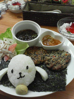 鶏肉やひじき、しそ、ニンジンなどが入っている豆腐ハンバーグや根菜サラダ、もずく酢などヘルシーなプレートに、サラダ、デザート、ドリンクで750円は、なかなかお得です。
